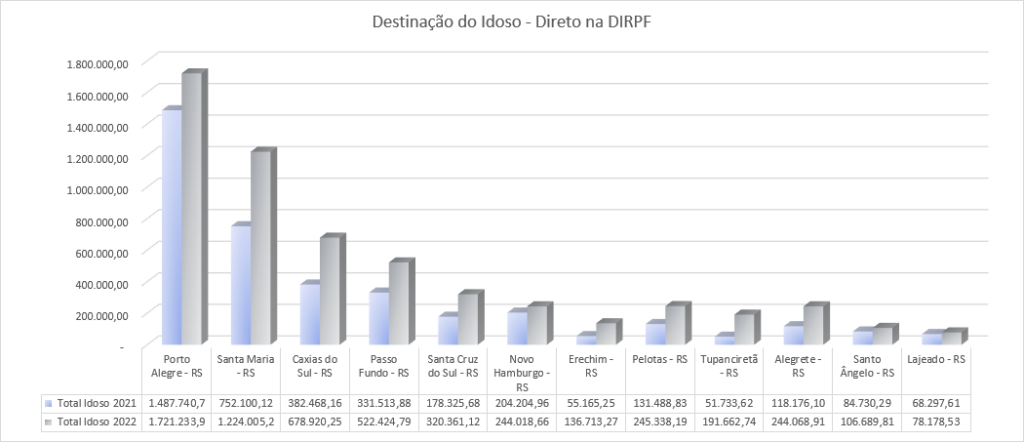 De acordo com a Delegacia da Receita Federal, com sede em Novo Hamburgo, os santa-cruzenses ampliaram, em 2022, esse repasse. Para os pequenos, passou de R$ 492.182,35 para R$ 539.699,66; às entidades beneficiadas pelo fundo do idoso receberam R$ 178.325,68, em 2021, subindo para R$ 320.361,12, em 2022.