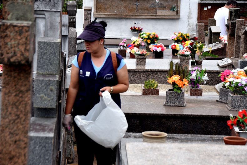 Durante as visitas aos cemitérios, agentes de controle de endemias de Santa Cruz atuavam para impedir a proliferação do Aedes aegypti entre os túmulos. A principal preocupação é com a embalagem de plástico em torno dos vasos de flores, que acumulam água e servem para abrigar o mosquito. Na área do Cemitério Católico, a agente Alice de Fátima Cardoso da Rosa alertou os visitantes sobre o risco.