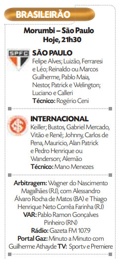 o Internacional. A grande preocupação é a lateral-direita. Sem Rafinha, suspenso, e Igor Vinícius e Moreira, lesionados, Rogério Ceni será obrigado a improvisar no setor.