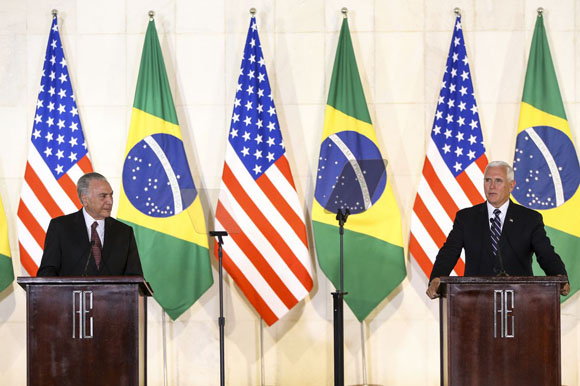O vice-presidente dos Estados Unidos, Mike Pence, defendeu nesta terça-feira, 26, a política de “tolerância zero” contra a imigração ilegal para os EUA e pediu para que as pessoas “não arrisquem a vida” tentando ingressar em solo norte-americano. A afirmação foi feita ao lado do presidente da República Michel Temer, durante declaração conjunta no Palácio do Itamaraty, após almoço de recepção oferecido pelo governo brasileiro. Pence está no Brasil desde o início da manhã de hoje, na primeira visita de alto nível de um representante do governo Donald Trump ao Brasil.
