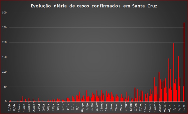 Santa Cruz tem 4.072 moradores que tiveram confirmação da Covid-19. Destes, 25 faleceram, 3.518 estão recuperados e 529 seguem em acompanhamento. Dos casos ativos, 19 estão hospitalizados – 11 no Hospital Ana Nery e oito no Hospital Santa Cruz. A Secretaria Municipal da Saúde ainda acompanha 207 pessoas com suspeita de infecção pelo novo coronavírus.