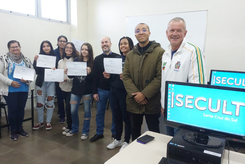 Dentro da perspectiva da Prefeitura de Santa Cruz do Sul de oferecer capacitação para possibilitar a inserção de pessoas no mercado de trabalho, a Secretaria de Cultura finalizou mais uma etapa da oficina de informática. No total, mais de 30 pessoas concluíram o curso. Durante o período de 40 horas/aula, ministradas pelo instrutor Filipe Flores, os alunos aprenderam noções básicas de editor de textos e de planilhas eletrônicas, PowerPoint e conceitos básicos de internet.