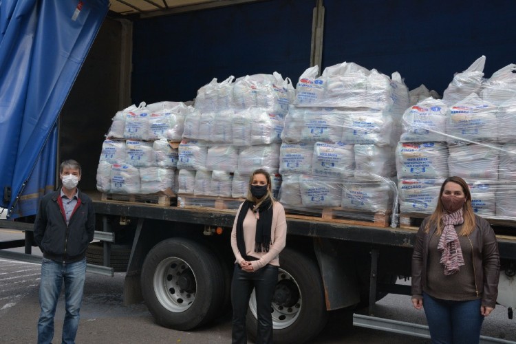 Para ajudar as famílias de estudantes da rede municipal de ensino em situação de vulnerabilidade social, a Secretaria de Educação de Santa Cruz do Sul recebeu mais um auxílio significativo nessa quarta-feira, 6. A Philip Morris Brasil doou 10 toneladas de alimentos. A secretária Juliana Bach recebeu os donativos dos representantes da empresa no município – a gerente de Qualidade, Rochele Martins, e o gerente de Saúde, Segurança e Meio Ambiente, Eduardo Schmitt.