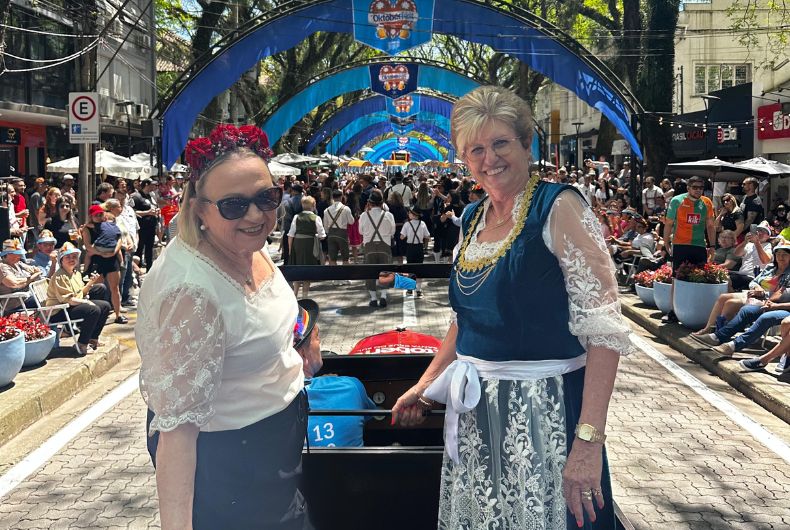A secretária estadual da saúde, Arita Bergmann, participou do segundo desfile da 39ª Oktoberfest, na manhã deste domingo, 20. Ao lado da prefeita Helena Hermany, ela percorreu uma parte do trajeto na Rua Marechal Floriano a bordo da Fubica.