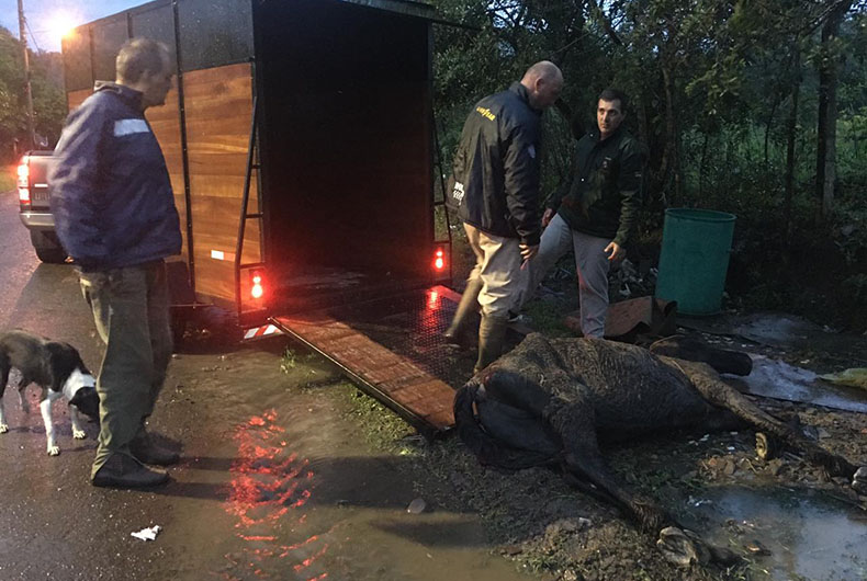 O animal foi encontrado deitado no chão, em uma poça d’água, com uma corda amarrada ao corpo e atada à cerca. No momento, ainda chovia e fazia frio na cidade. A primeira avaliação indicou um equino macho, em torno de 12 anos de idade, extremamente magro, desidratado e já apresentando hipotermia pelo tempo que se encontrava dentro d’água. O cavalo foi recolhido em um reboque e foi transportado deitado, pois não tinha condições de se manter em pé.