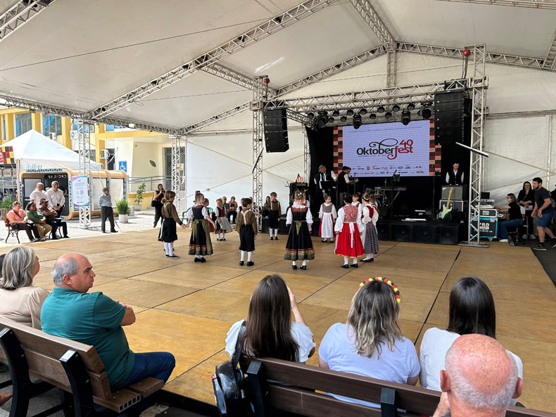 Ao entrar no Parque da Oktoberfest durante a Festa da Alegria, os visitantes são recebidos pela atmosfera vibrante das músicas e danças alemãs no palco do pórtico. No sábado, diversos grupos folclóricos se apresentaram no local, exaltando a cultura germânica por meio de danças e trajes típicos que encantaram o público e embelezaram as performances.