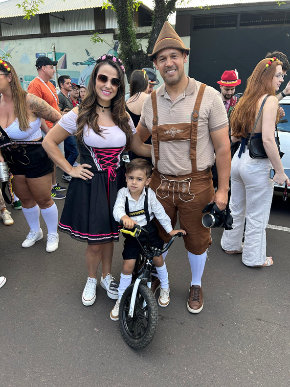 Além de amigos, o evento se mostra convidativo para grupos familiares. O casal Fernanda Marques, de 38 anos, e Lucas Corrêa, de 42, participa todos os anos da iniciativa e nesta edição levou o filho Augusto Marques, de 3 anos, pela primeira vez. O pequeno chamou a atenção ao desfilar de bicicleta.