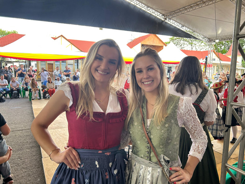 Camila Schaefer, coordenadora da Cultura da 40ª Oktoberfest, ao lado de Daniela Schoeninger, acompanhou as apresentações dos grupos folclóricos e contou que tem sido especial viver a festa de outra forma. Ex-soberana da 39ª edição, junto de Daniela, disse que participar da organização, especialmente nessa área, é motivo de orgulho. “A cultura é a essência da nossa festa.”