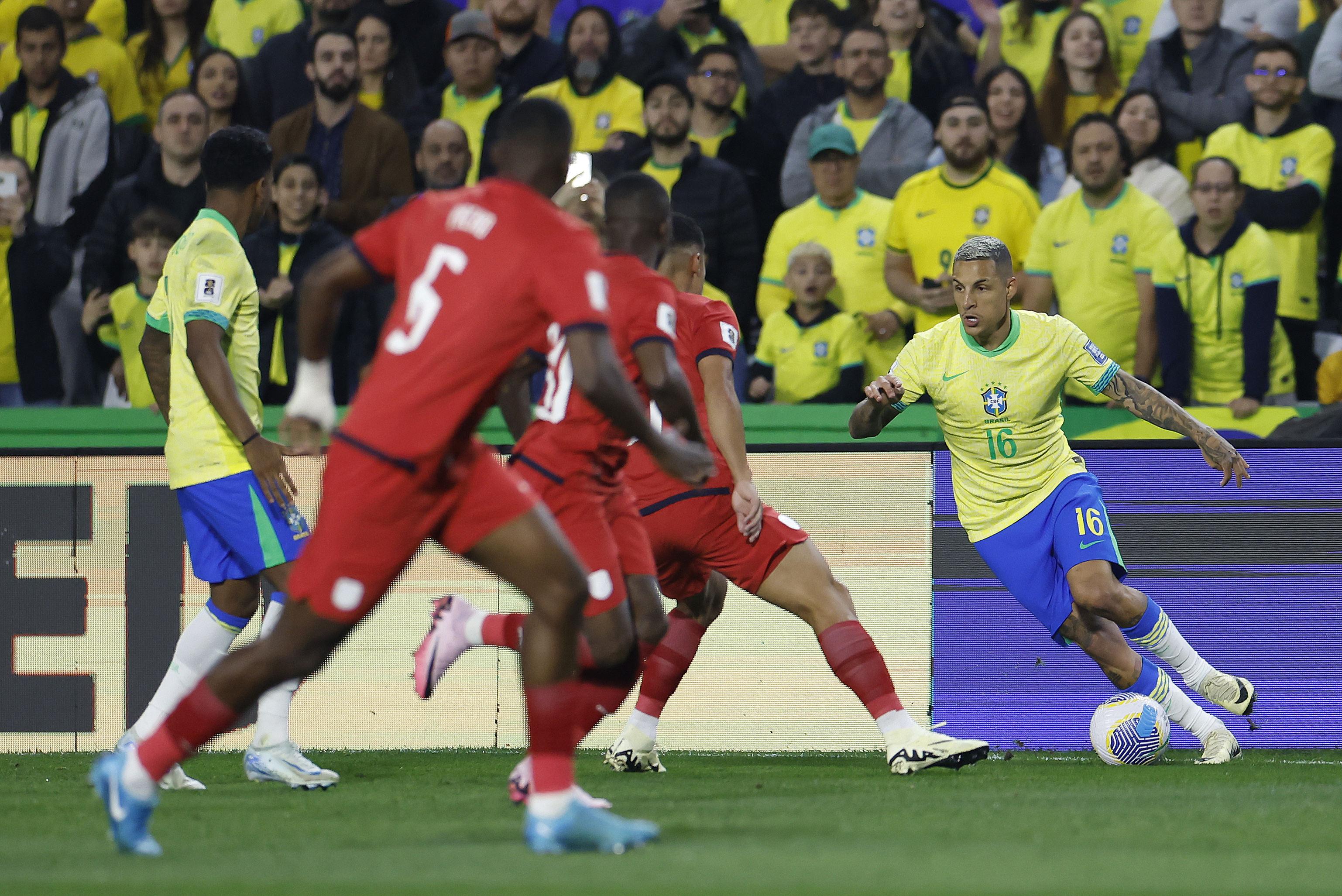 Uma movimentação diferenciada do Brasil na última linha de ataque ajudou na construção do primeiro gol, aos 30 minutos. A seleção decidiu arriscar com Rodrygo um chute de fora da área, a bola desviou na marcação, enganou o goleiro Galíndez e ainda desviou na trave antes de balançar a rede do Equador. Obra mais da sorte do que do juízo.