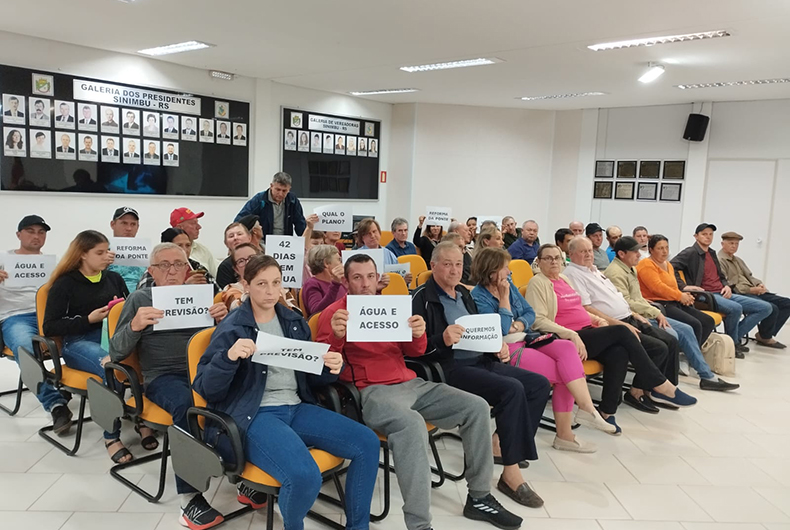 A falta de água e de acesso a Alto Sinimbu – situada a seis quilômetros do centro de Sinimbu – levou moradores a protestarem nessa terça-feira, 11, à noite na Câmara de Vereadores. Com cartazes, um grupo formado por 40 pessoas cobrou soluções para restabelecer o fornecimento e a reconstrução da travessia. A 18ª sessão solene foi temporariamente suspensa, para que os vereadores conversassem com a população. Mais tarde, liberaram os microfones para duas pessoas se manifestarem.