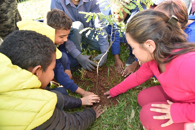 Crianças plantaram muda de sibipurina na Escola Harmonia