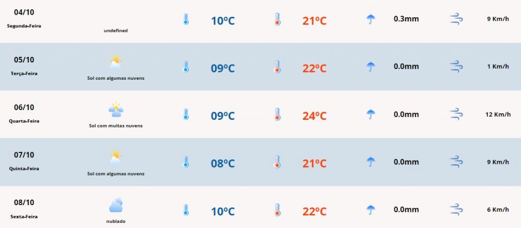 O amanhecer e a madrugada de terça-feira, 5, devem seguir com marcas no entorno dos 10 graus. Já o dia será marcado pela presença de sol. Na quarta, 6, quinta, 7, e sexta, 8, o tempo segue seco, com temperaturas passando dos 20 graus no Vale do Rio Pardo. As madrugadas seguem geladas com uma média de 9 graus.