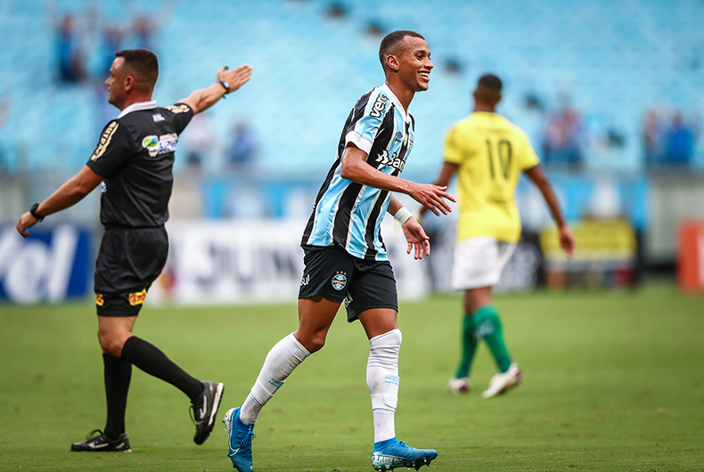 Sob o impacto da derrota para o Inter, no clássico do meio de semana, o técnico Roger Machado promoveu mudanças e escalou Rodrigues, Bitello e Gabriel Silva entre os titulares. Com essa formação, o Tricolor mostrou maior poder de fogo. Mesmo sem apresentar a mesma organização do rival, o time da casa foi melhor na etapa inicial, sob a liderança de Campaz. O colombiano começou a brilhar aos 25 minutos, quando marcou um gol olímpico. No lance, finalizou na primeira trave e o goleiro Edson não conseguiu impedir o belo gol. Confiante, ele quase anotou o segundo quatro minutos depois ao acertar forte chute da entrada da área, no travessão. Foram ainda mais duas boas chances de gol para o Grêmio, num primeiro tempo em que o time da casa jogou mais na base da raça do que da técnica e disciplina tática.