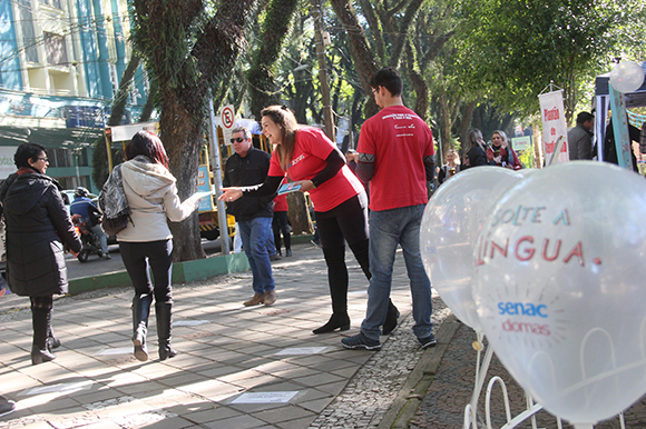 Durante toda a manhã o Senac Santa Cruz realizou a Blitz Solte a Língua, na Praça Getúlio Vargas, no Centro de Santa Cruz do Sul. Na ocasião, foram divulgados detalhes sobre cursos e testes de conhecimento de idiomas oferecidos pela entidade, que está com as matrículas abertas para diferentes níveis do curso de inglês. Os interessados em aprender a língua podem começar fazendo um teste de nivelamento gratuito no Senac, sempre nas terça-feiras, às 18 horas.
