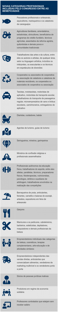 Com a decisão, o Congresso Nacional incluiu mais de 20 categorias na lista do benefício, entre eles extrativistas, assentados da reforma agrária, artesãos, profissionais da beleza (como cabeleireiros), ambulantes que comercializem alimentos, diaristas, garçons, motoristas de aplicativos, taxistas e catadores de recicláveis.