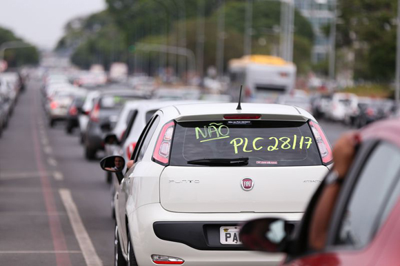 Durante a discussão do projeto, protestos na Esplanada dos Ministérios ao longo da tarde reuniram 3 mil pessoas, entre taxistas e motoristas de aplicativos. Duas confusões foram registradas pelas forças de segurança, que chegaram a reter o trânsito por alguns minutos. Em uma delas, os taxistas que se dirigiam em direção aos motoristas de aplicativos foram contidos com spray de pimenta pela Polícia Militar, que prendeu um motorista por desacato.