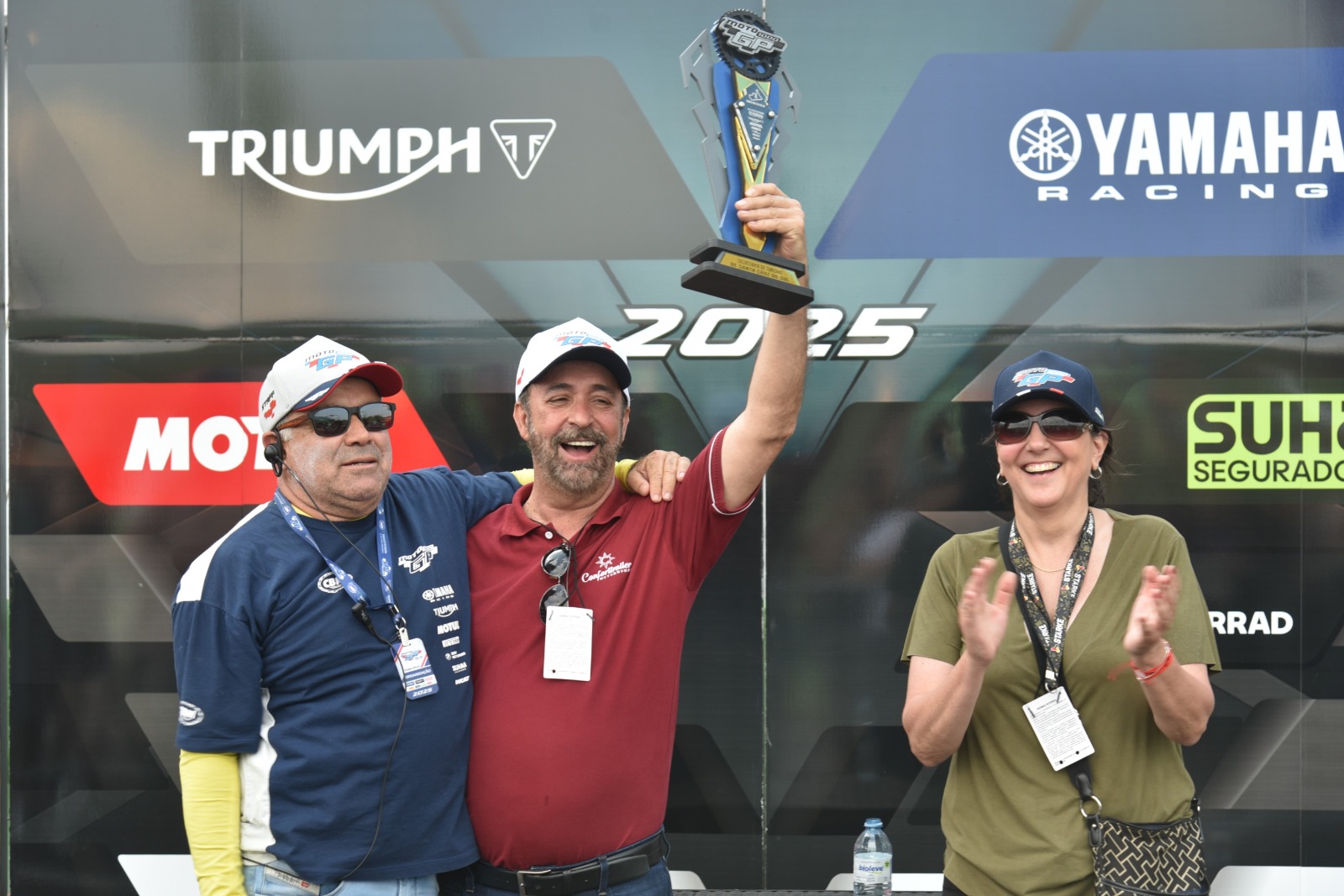 Prefeito Sérgio Moraes, produtor do Moto1000GP, Orlei Silva, e secretária de Turismo, Jaqueline Marques de Souza, vibram ao fim das corridas, celebrando o sucesso do evento