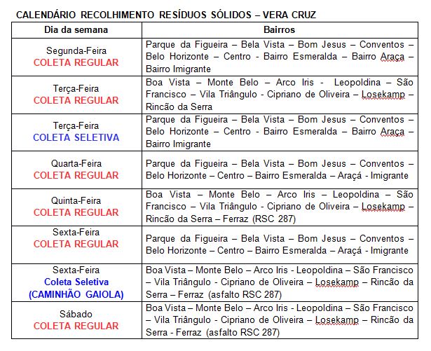 Com a troca, foi proposta também uma modificação no cronograma de recolhimento, que vinha sendo divulgado há um mês. O início do novo calendário de coleta, no entanto, gerou dúvidas nos moradores. A Prefeitura esclareceu que o roteiro voltará a ser realizado conforme o cronograma anterior. O trabalho terá o acréscimo da coleta seletiva, a ser realizada pela mesma empresa licitada. Nas terças-feiras, será feita no roteiro do Centro, e às sextas-feiras, nos bairros.