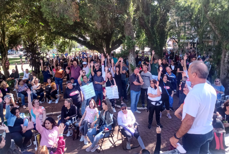 A Praça da Bandeira recebeu, nesta manhã desta quarta-feira, 6, a realização da assembleia conjunta do Sindicato dos Servidores Municipais (Sinfum) e do Sindicato dos Professores Municipais (Sinprom). Com a participação de mais de mil profissionais, o grupo definiu por entrar em “estado de greve”, que é um mecanismo para demonstrar inconformidade com o percentual de reajuste apresentado pela Prefeitura.