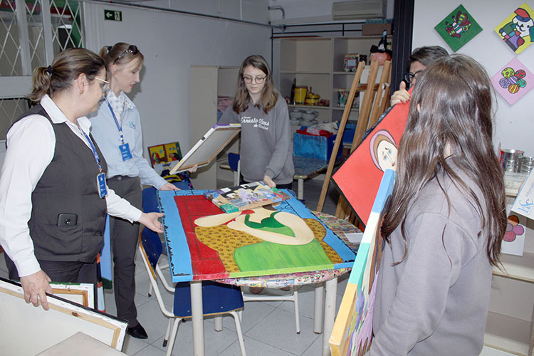 O Hospital Santa Cruz (HSC) recebeu, no dia 6 de novembro, a doação de nove quadros produzidos por estudantes do programa contra turno escolar do Serviço Social da Indústria (Sesi). A entrega foi feita pela orientadora educacional Vânia Ozorio e pela analista de educação do Sesi, Rafaela Rech, à gerente de hotelaria e serviços da casa de saúde, Neijan Konzen, e à ouvidora da Instituição, Renata Heidrich. As estudantes Natalie Schoepf e Rafaela Voese Pereira representaram o programa.