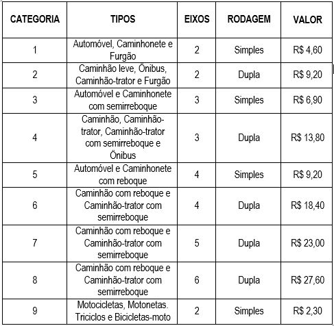 À meia-noite do próximo sábado, 14, entra em vigor o reajuste de 4,31% na tarifa das sete praças de pedágio administradas pela CCR ViaSul. Para carros, o valor passará de R$ 4,40 para R$ 4,60 nas praças de Três Cachoeiras, na BR-101; Gravataí, na BR-290; e Montenegro, Paverama, Fontoura Xavier e Victor Graeff, na BR-386. Já no pedágio de Santo Antônio da Patrulha, na BR-290, onde a cobrança acontece somente no sentido litoral, a tarifa básica passará de R$ 8,80 para R$ 9,20.