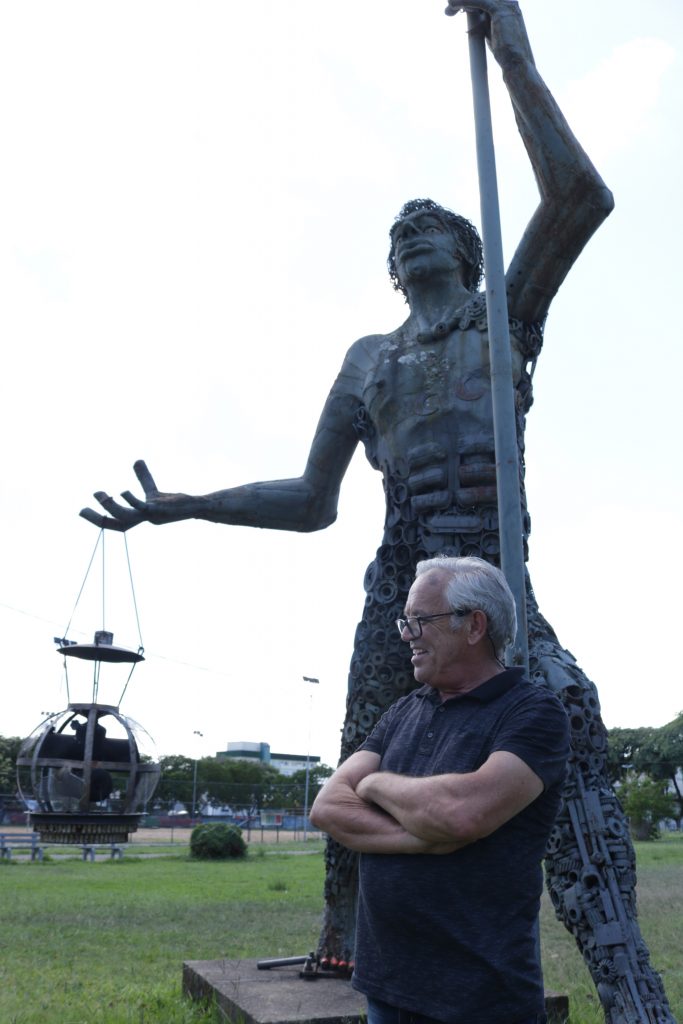 As comemorações da Semana da Pátria em Santa Cruz do Sul no início deste século eram marcadas por uma situação que incomodava a Prefeitura. Não havia um espaço fixo para a pira, que era instalada em pontos móveis. Diante dessa situação, em 2004 o Município encomendou uma nova estrutura fixa para o fogo simbólico na Praça Siegfried Heuser. Coube ao artista e escultor Alceo Luiz de Costa (na foto) trabalhar a obra em uma oficina no Cras Beatriz. “Lá eu ensinava meus alunos a soldar, para arrumar portões, grades e fazer reparos pequenos em domicílios. Quando chegou esse pedido da Secretaria de Educação, pensei que seria interessante criar um elemento de metal para segurar a pira da Pátria”, conta Alceo.