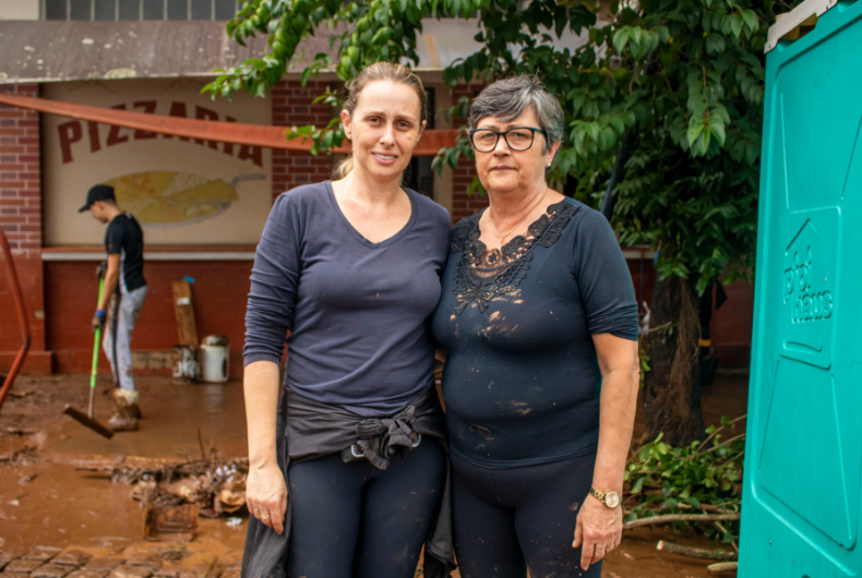 Enquanto muitos moradores e voluntários de outros locais garantiam a retirada de móveis e eletrodomésticos danificados, na rua, um grupo de pessoas garantia a produção de refeições e a distribuição de água e lanche. É o caso de Silvia e Bibiana Backes, mãe e filha. Elas tiveram prejuízo na pizzaria da família, mas, em meio ao trabalho de limpeza, levaram sanduíches e ofereciam para as pessoas que trabalhavam.