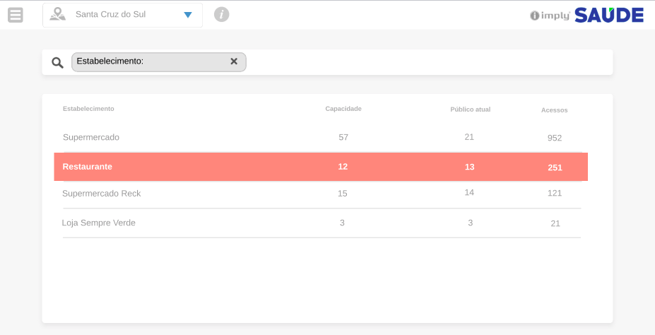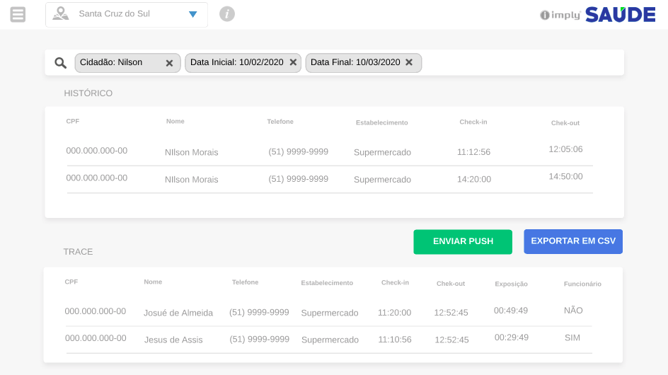 A gestão também terá disponíveis centrais de monitoramento, apresentando informações como a movimentação total do dia, a quantidade de estabelecimentos e de cidadãos cadastrados e os últimos acessos realizados. Conforme a Imply, essas informações permitem a otimização da aplicação de testes da Covid-19, para pessoas com maior propensão a estarem contaminadas, identificando estabelecimentos com maiores aglomerações, por exemplo.