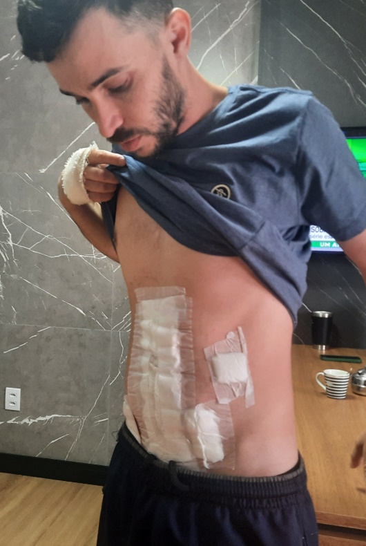 Bastante debilitado, ainda com sequelas, o rapaz, que trabalha desde os 17 anos como operador em uma distribuidora de produtos alimentícios em Linha João Alves, mostrou as marcas dos tiros. Um projétil permanece alojado e outro foi retirado em cirurgia. Na mesma ocorrência, João Omar Lenz, de 44 anos, conhecido pelo apelido de Zé, morreu após ser atingido com quatro tiros, no umbigo, lateral do corpo e costas.