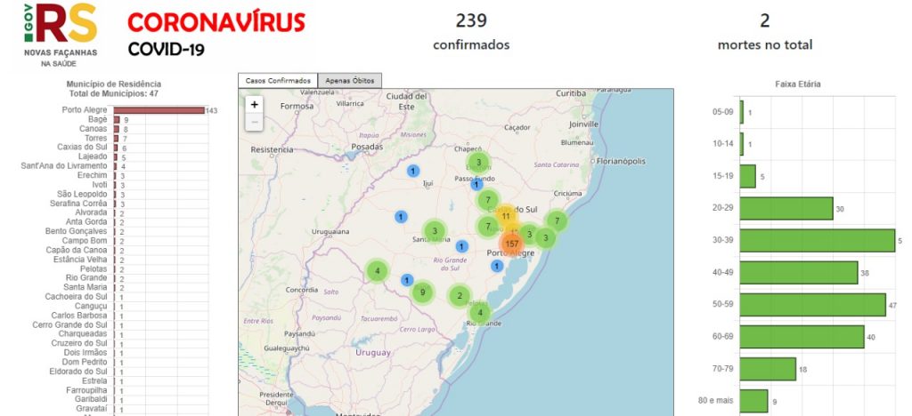 O Laboratório Central do Estado (Lacen) divulgou neste domingo, 29, mais 13 casos positivos de infecção com o coronavírus no Rio Grande do Sul. Agora são 239 casos confirmados para a doença e duas mortes.