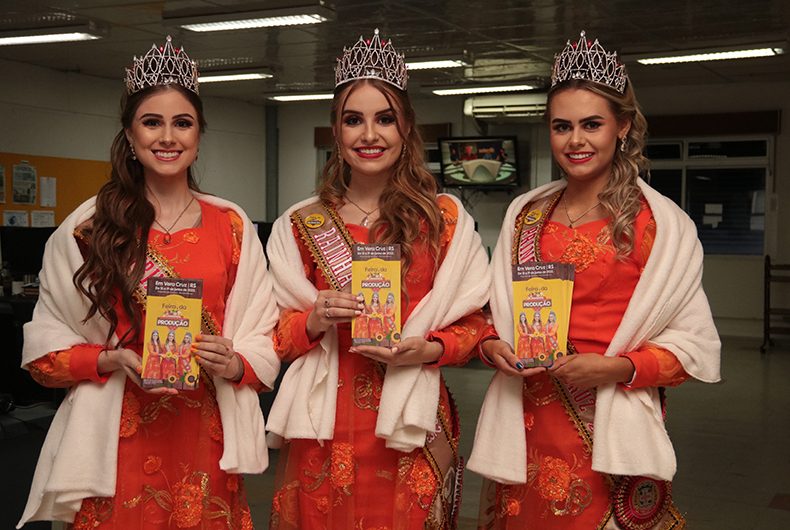 O trio de soberanas de Vera Cruz, formado pela rainha Daniéli Schroeder e princesas Isadora da Silva e Mariana Tatsch, esteve na tarde dessa quarta-feira, 2, na Gazeta Grupo de Comunicações para divulgar a 12ª Feira da Produção. O evento é tradicional em Vera Cruz e integra as celebrações de 63 anos do município. A expectativa para este ano é receber 40 mil visitantes, superando todas as outras edições. O acesso às atrações é gratuito.