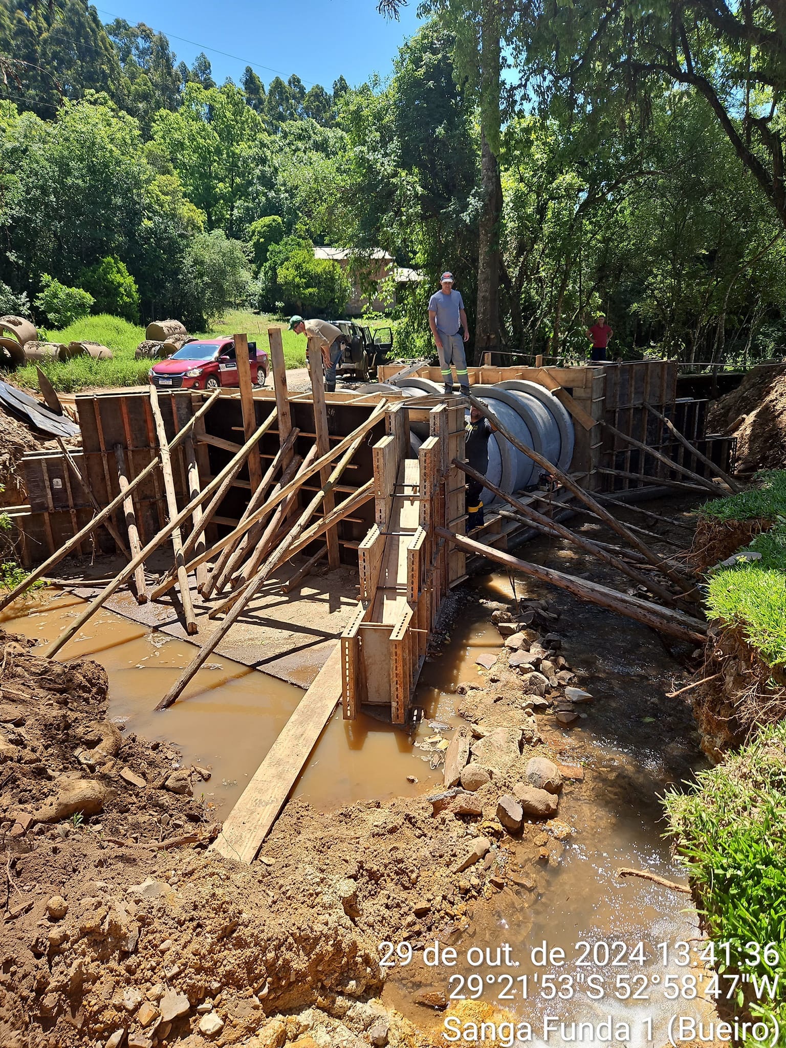 Entre as áreas já em intervenção estão dois bueiros na região da Sanga Funda (foto), que estão sendo reconstruídos com estruturas duplas e canos de 1,5 metro de diâmetro para ampliar a capacidade de escoamento. Na Rua Armindo Müller, no Bairro Rio Branco, uma galeria simples de 2,5 x 2,5 metros está em fase de execução.