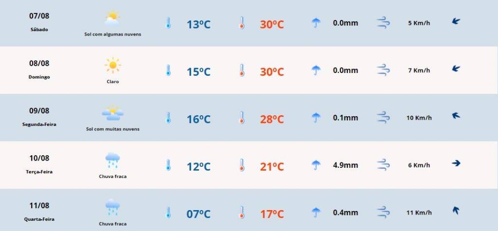 Contudo, para a alegria de muitos, a terça-feira, 10, terá a chegada de uma nova frente fria que vai trazer chuva – ou até temporais – para a região. Na quarta-feira, 11, de acordo com a MetSul, volta a fazer frio e a mínima pode chegar a 7 graus.