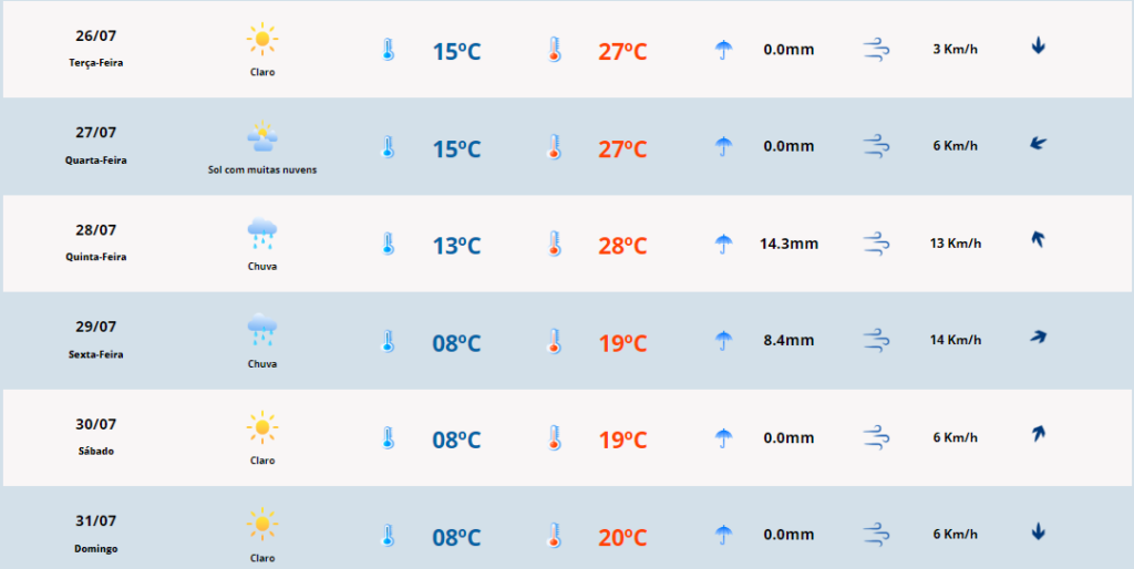 Nesta quarta-feira, 27, o sol deve continuar brilhando, de modo que as marcas serão similares às registradas nesta terça. No entanto, o amanhecer pode ter neblina e nevoeiro em diversos pontos. Na quinta-feira, 28, o calor se mantém expressivo, atingindo 28 graus. Contudo, uma frente fria deve atuar no final do dia, trazendo risco de temporais à região. Conforme a MetSul Meteorologia, está previsto acumulado de cerca de 14 milímetros de precipitação.