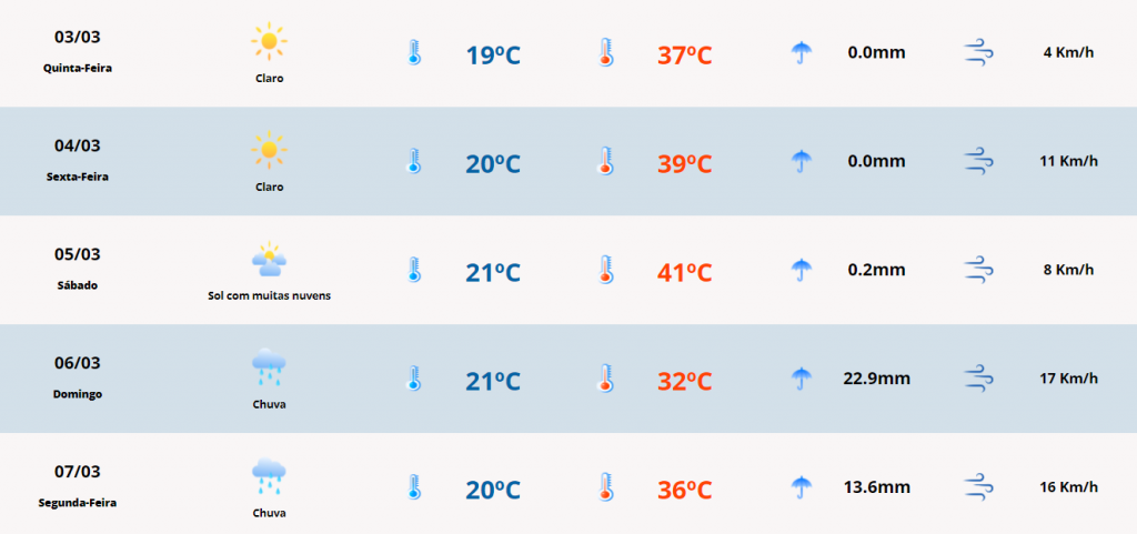 No entanto, o sol deve predominar no decorrer do dia, inclusive com poucas nuvens no céu. As máximas devem passar com facilidade dos 30 graus, chegando a 37 graus em muitos municípios da região. Nesta sexta-feira, 4, embora apareçam algumas nuvens no céu, a temperatura deve chegar a 39 graus. E neste sábado, 5, os termômetros sobem ainda mais, intensificando o calor na parte da tarde, podendo marcar 41 graus.