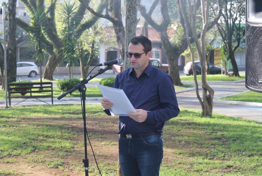 Cláudio Antônio Westphalen, diretor da EMEB Dr. Adolpho Sebastiany, em sua fala sobre os homenageados | Foto: Victor Paranhos