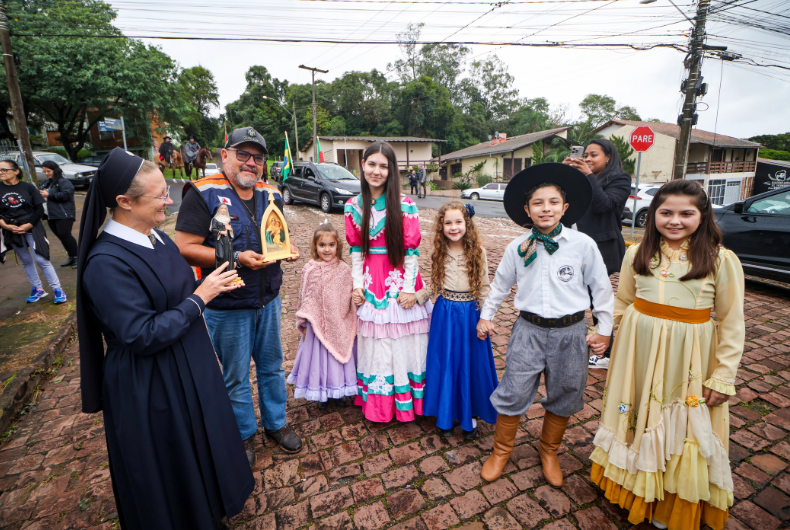 A primeira parada dos caminhões em Santa Cruz do Sul foi na Escola Estadual Willy Carlos Fröhlich – o Polivalente –, de onde foram conduzidos por cavalarianos até o CTG. A chegada ao destino final foi marcada por emoção e também por um momento de fé. Além dos donativos, os responsáveis pela carga trouxeram uma imagem de Santa Rita. Em troca, eles receberam uma imagem da Mãe, Rainha e Vencedora Três Vezes Admirável de Schoenstatt.