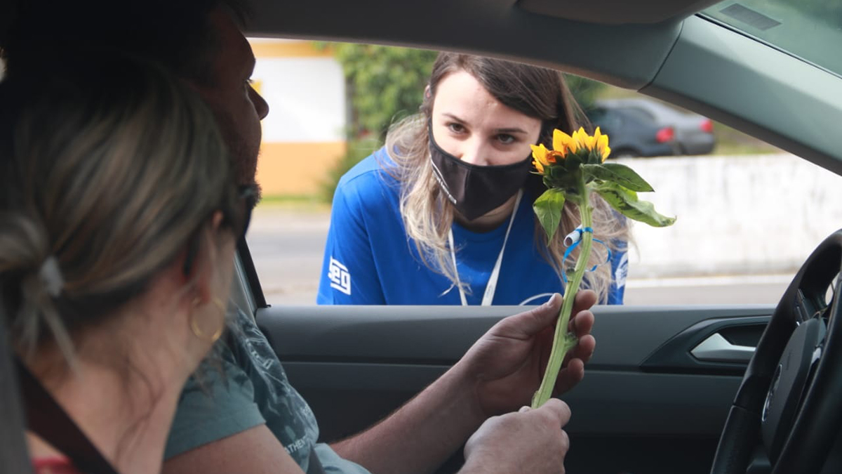 No dia em que comemora dez anos de atividade, a Solled Energia preparou uma ação de conscientização ambiental. Parte dos 150 integrantes da equipe distribui 300 girassóis para os motoristas que passam em frente ao posto do policiamento rodoviário, na RSC-287.
