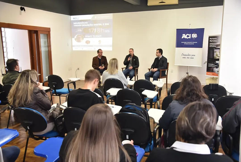 A edição de maio do Café Empresarial trouxe o case da startup meuResíduo Soluções Tecnológicas. O empreendedor Fábio Ronaldo Tusset, co-fundador e CEO da empresa, foi o painelista do encontro, promovido pela Associação Comercial e Industrial (ACI) de Santa Cruz, na manhã desta terça-feira, 17, no auditório 2 da entidade. Para uma plateia formada por empresários e profissionais de empresas, Tusset apresentou a palestra “meuResíduo: transformação digital e ESG”, compartilhando a trajetória da premiada startup que, atualmente, é referência na área de gestão de resíduos no país e já começa a trilhar o caminho para se consolidar também no mercado exterior. O evento teve a mediação dos diretores da ACI, Eduardo Kroth, 2º secretário, e Eduardo Bitencourt, de Tecnologia, e foi transmitido em tempo real pelas plataformas do Facebook e YouTube da entidade.