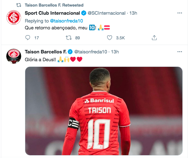 Taison ficou em campo por 72 minutos, até ser substituído por Caio Vidal, que acabou marcando um golaço de bicicleta. “Grupo todo me abraçou, fez chegar do jeito que cheguei e me deixou feliz para jogar. A palavra de hoje é gratidão por voltar a jogar no Inter e pela vitória. Sempre trabalho pelo grupo”, ressaltou Taison.