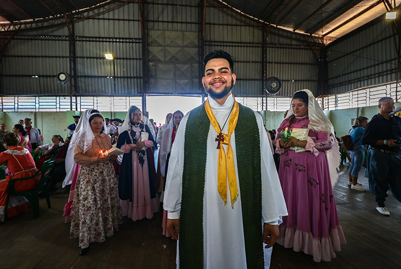 Enquanto o pessoal do Vale do Taquari fazia a sua exibição, o grupo do CTG Patrulha do Oeste, de Uruguaiana, preparava-se para atuar em nome da 4ª RT. À frente estava o 1º Guri Farroupilha, Nícolas Aguilar, 17 anos. Ele trajava uma batina, simbolizando a presença do padre Paulo Aribe, na encenação que enalteceu o hábito da realização das romarias.