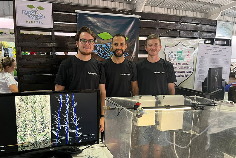 Integrantes de uma startup de Pelotas trouxeram para a Expoagro Afubra 2023 uma ideia de tecnologia para facilitar a vida do pequeno produtor. Através de um aplicativo do celular o agricultor poderá acompanhar a produtividade do campo e evitar desperdícios na hora da pulverização. O mecanismo surgiu de um projeto acadêmico, junto à Universidade Federal de Rio Grande, como explicou o CEO da Demetec Agro, Mauro Lilles. Ainda atuam no projeto Jardel Prado e Manoel Hosser.