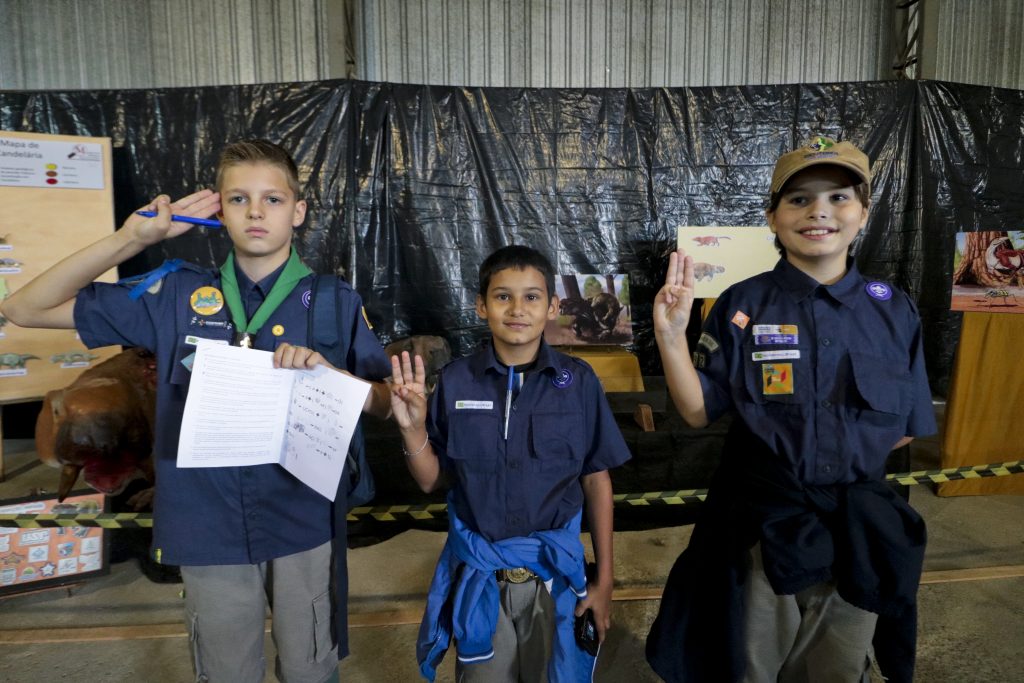 Essas e muitas outras curiosidades sobre dinossauros podem ser conferidas na Expocande 2022. No museu, os meninos dos Escoteiros do Botucaraí, Matheus, Gabriel e Kaio, estavam desvendando enigmas, uma ação proposta pelo grupo. “A gente tem que tirar foto das coisas que a gente encontra no enigma”, conta Matheus.