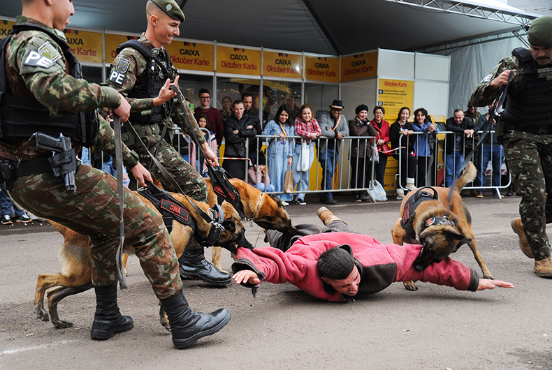 Outra atração que chamou a atenção de adultos e crianças na tarde desta quinta-feira, 12, foi a apresentação do 7º Batalhão de Infantaria Blindado (BIB) de Ordem Unida Sem Comando e demonstração de abordagem utilizando os cães de guerra. As atividades, realizadas na lateral do Pavilhão 2, passam a integrar diariamente a programação da Festa da Alegria.