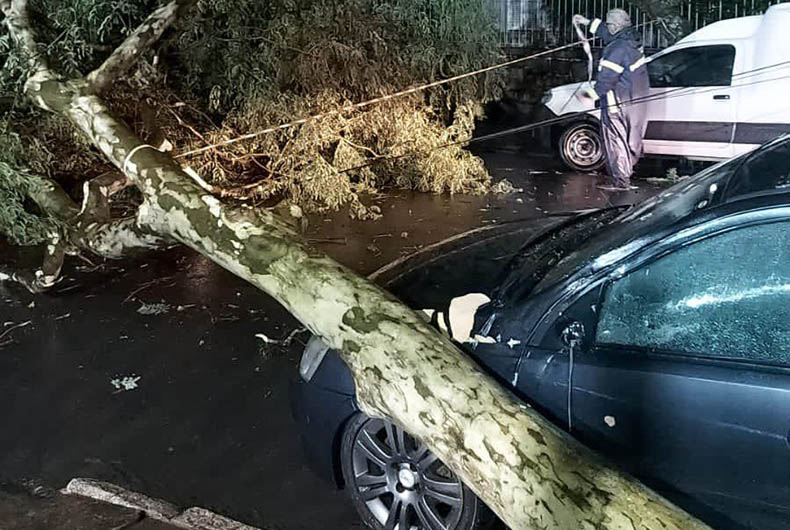 Imagens compartilhadas pela prefeitura no Twitter mostram alguns dos chamados, em um deles, uma árvore de grande porte estava caída sobre a via e sobre um veículo na rua Conde de Porto Alegre. A Empresa Pública de Transporte e Circulação, que gere a mobilidade urbana da capital, registrou 21 ocorrências devido às chuvas, sendo sete com bloqueio total da via por acúmulo de água e seis por queda de árvore.