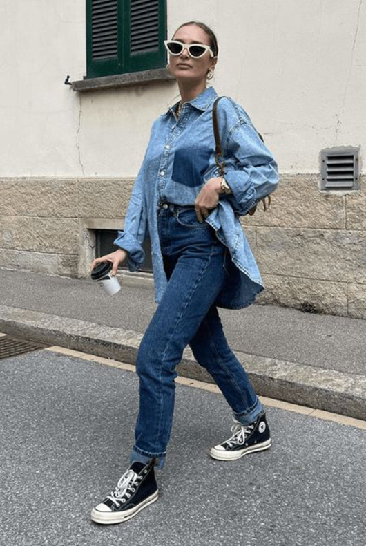 - All jeans – Vamos falar a verdade, né? O look all jeans nunca saiu de moda. Esse tipo de composição é formado somente por peças jeans, que podem ser uma só, como um vestido, ou com calças e saias e camisas e jaquetas.