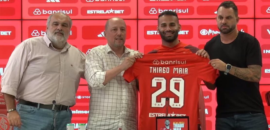 O volante Thiago Maia recebeu a camisa 29 do Internacional e foi apresentado nesta segunda-feira, 11, pelo presidente Alessandro Barcellos, pelo diretor esportivo Magrão e pelo vice de futebol Felipe Becker. O jogador destacou o projeto ambicioso do clube e disse que recebeu muitas ligações do técnico Eduardo Coudet. O lateral Renê também foi importante na intermediação.
