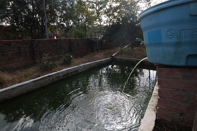 Depois de muito planejamento, em pouco tempo estaria instalado o sistema de calhas que há duas décadas capta a água do telhado e a leva até um tanque de concreto que mais parece uma piscina no quintal da residência. No reservatório de oito metros de extensão com 2,5 de largura e 1,5 metro de profundidade é feita a criação de peixes que, pelo menos duas vezes ao ano, são retirados para consumo da família. “A ideia foi do meu irmão já falecido e a obra foi feita pelo meu marido”, conta a costureira Maria Francesquet. Atualmente, o espaço é ocupado por tilápias alimentadas diariamente com ração. “Acho que tem umas 30”, estima.