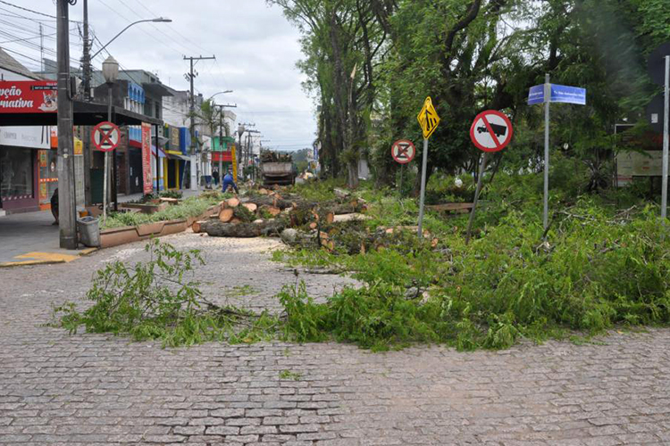 As tipuanas localizadas na Rua Osvaldo Aranha, no calçadão do Centro de Venâncio Aires, foram cortadas na manhã desse domingo, 20. O corte das árvores começou por volta das 7 horas e foi uma iniciativa de proprietários de imóveis localizados entre as ruas Jacob Becker e General Osório.