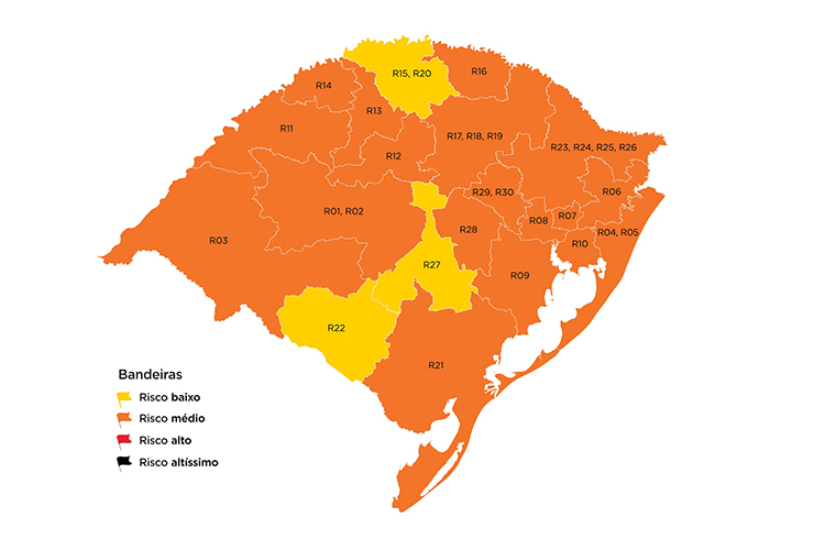 Das 21 regiões Covid, apenas Uruguaiana, Bagé e Guaíba não aderiram ao sistema de gestão compartilhada. As outras 18 já adotam protocolos alternativos às bandeiras definidas pelo governo – Cachoeira do Sul, Canoas, Capão da Canoa, Caxias do Sul, Cruz Alta, Erechim, Ijuí, Lajeado, Novo Hamburgo, Palmeira das Missões, Passo Fundo, Pelotas, Porto Alegre, Santa Cruz do Sul, Santa Maria, Santa Rosa, Santo Ângelo e Taquara.